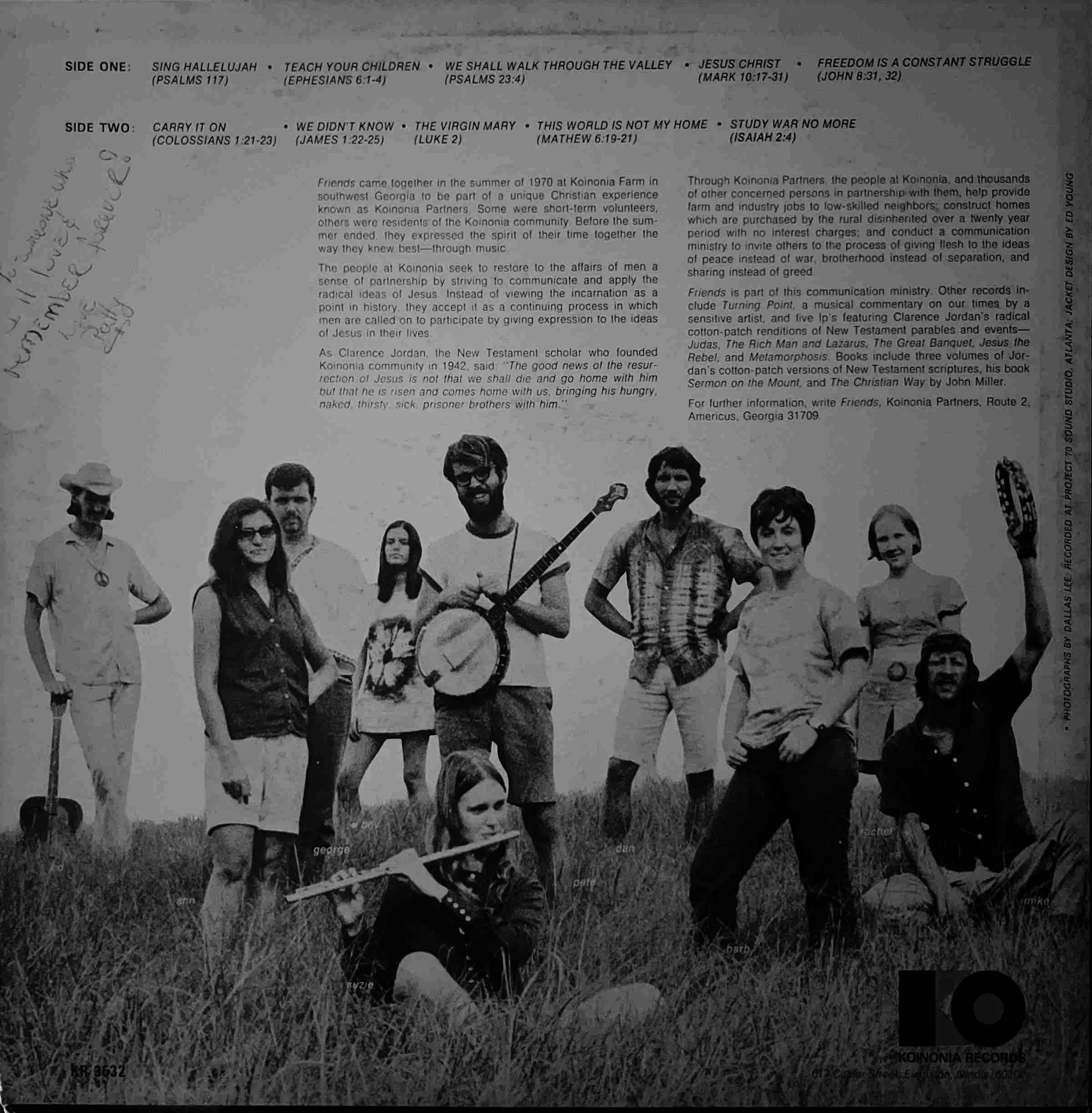 ![]() ![]() | Friends - FriendsChristian-Folk | Georgia | 19701970 LP by Christian music collective Friends, released on Koinonia Records. The group consisted of volunteers and residents at the Koinonia Farm community in southwest Georgia. Members of the group include (first names only) Ed, Ann, George, Bev, Suzie, Pete, Dan, Barb, Rachel, and Mike. As far as I can tell this is the only LP released by the group, but Koinonia Records has a few releases in the 1970s, including some sermons by Koinonia Farm founder Clarence Jordan. I can't find any additional information about the members of the group or if any of them had continued music careers. Koinonia Farm is an intentional Christian community founded in 1942 near Americus, Georgia, with the purpose of promoting racial equality and social justice. Clarence Jordan, a Southern Baptist minister, envisioned a place where people of different races could live together as equals in the segregated South. Due to their mission of racial integration, the farm faced intimidation and vandalism at the hands of white supremacists and the Ku Klux Klan. The community engaged in farming operations and developed various enterprises, such as a cooperative store and handmade crafts, to sustain themselves economically. Koinonia Farm also played a significant role in the Civil Rights Movement, serving as a refuge for activists and advocating for desegregation of the American South. The farm eventually pivoted to building low-rent and free housing for low-income Georgians, and this practice eventually branched off into the Habitat For Humanity Organization. Koinonia Farm continues operation today, though it seems a bit different in organizational structure and mission than it was in the 20th century. |