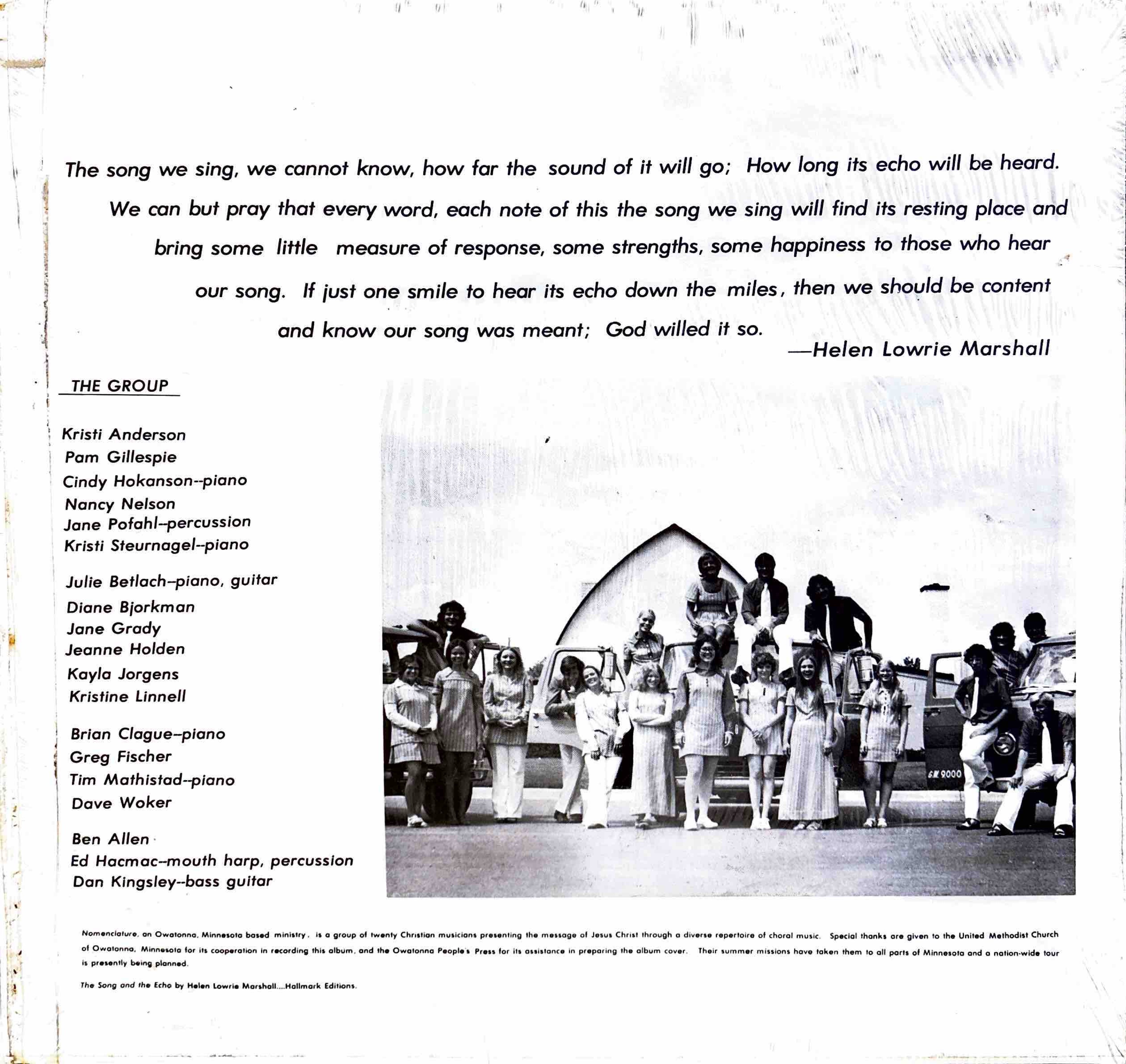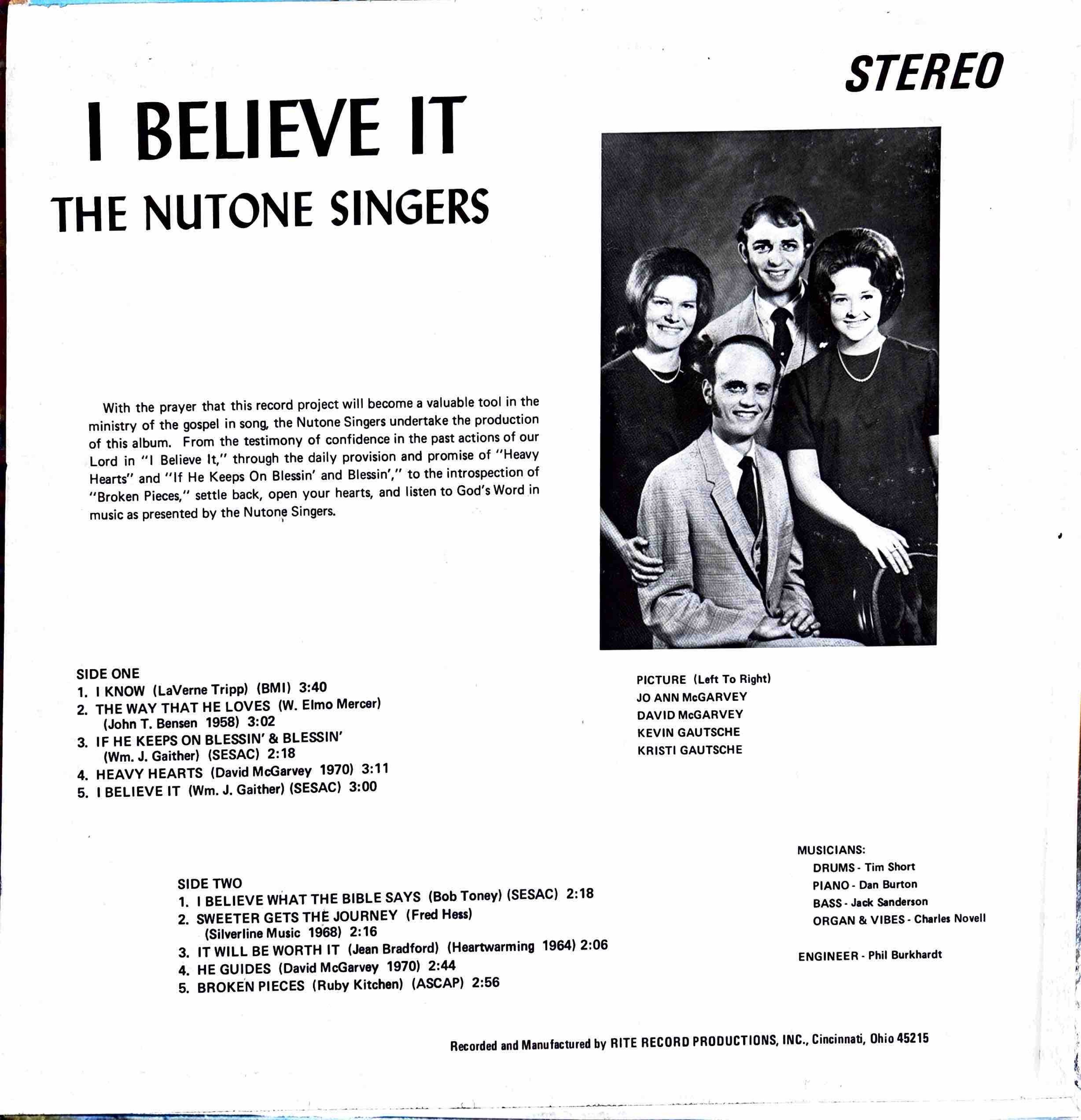 ![]() ![]() | Nutone Singers, The - I Believe ItGospel | Indiana | 1972Gospel LP from The Nutone Singers. The Nutone Singers were from New Paris, Indiana and the members were Jo Ann McGarvey, David McGarvey, Kevin Gautsche, and Kristi Gautsche. They were active during the 1960s and 1970s. The musicians on the LP are Tim Short on drums, Dan Burton on piano, Jack Sanderson on bass, and Charles Novell on organ and vibraphone. The LP was engineered by Phil Burkhardt. |