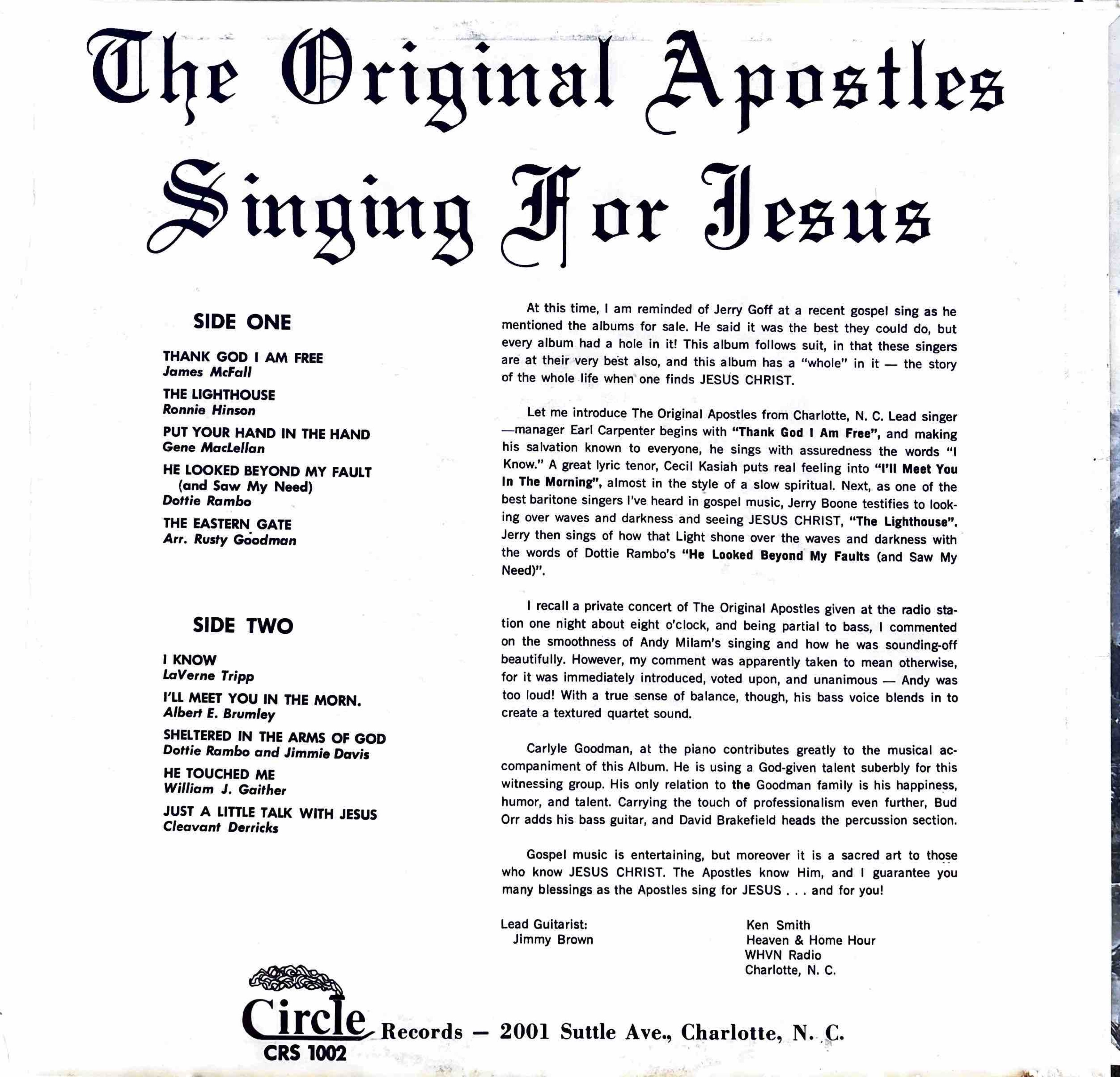 Original Apostles, The - Singing For JesusGospel | North Carolina | Unknown YearDescription coming soon! Tracklist A1 Thank God I Am Free A2 The Lighthouse A3 Put Your Hand In The Hand A4 He Looked Beyond My Fault A5 The Eastern Gate B1 I Know B2 I'll Meet You In The Morn. B3 Sheltered In The Arms Of God B4 He Touched Me B5 Just A Little Talk With Jesus |