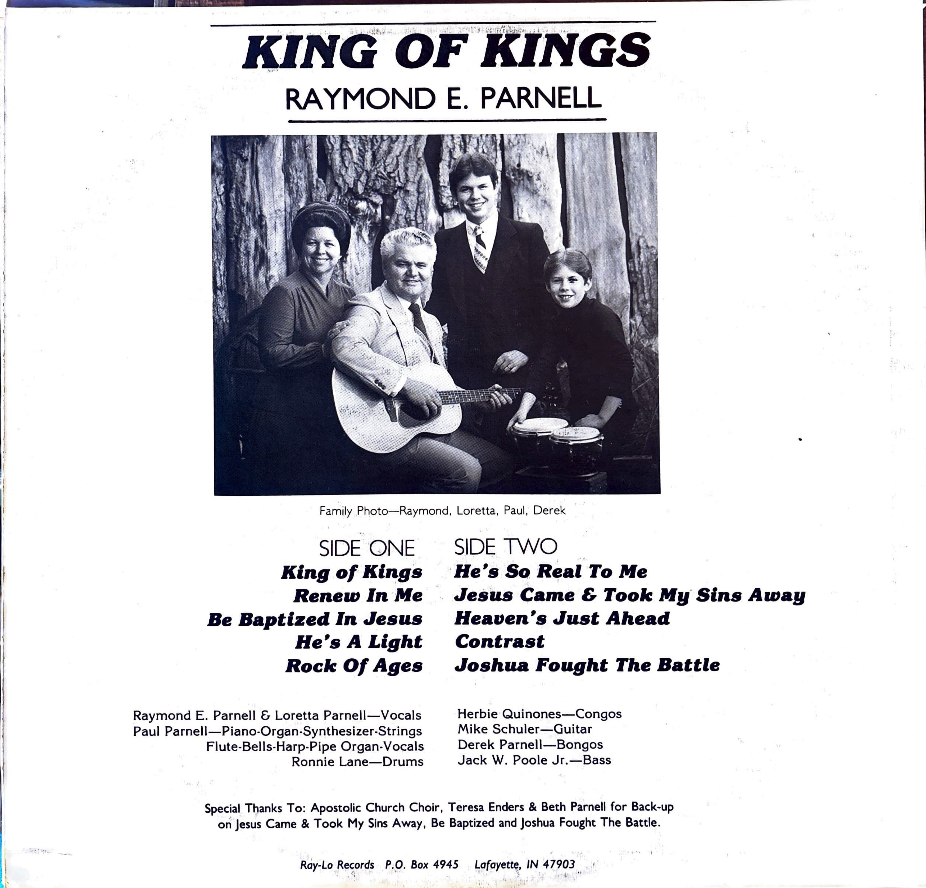 ![]() ![]() | Parnell, Raymond E. - King Of KingsGospel | 19811981 LP from gospel singer Raymond E. Parnell, released on Ray-Lo Records. Credits on the LP include Raymond and Loretta Parnell on vocals, Paul Parnell on piano/organ/synth/strings/flute/bells/harp/pipe organ/vocals, Ronnie Lane on drums, Herbie Quinones on congos, Mike Schuler on guitar, Derek Parnell on bongos, and Jack W. Poole Jr. on bass. |