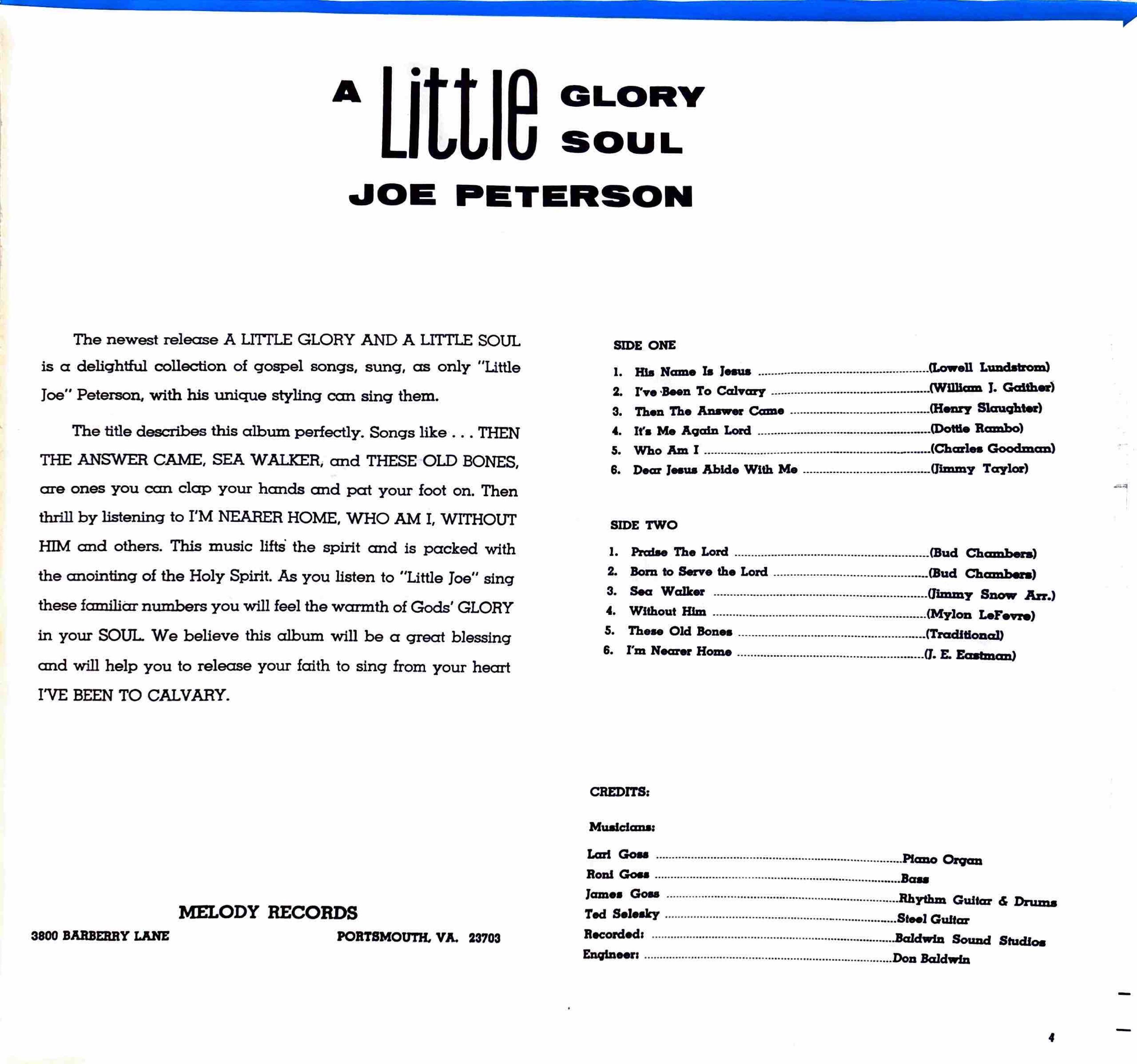 Peterson, Joe - A Little Glory And A Little SoulCountry-Gospel | Virginia | Unknown YearDescription coming soon! Tracklist A1 His Name Is Jesus A2 I've Been To Calvary A3 Then The Answer Came A4 It's Me Again Lord A5 Who Am I A6 Dear Jesus Abide With Me B1 Praise The Lord B2 Born To Serve The Lord B3 Sea Walker B4 Without Him B5 These Old Bones B6 I'm Nearer Home |