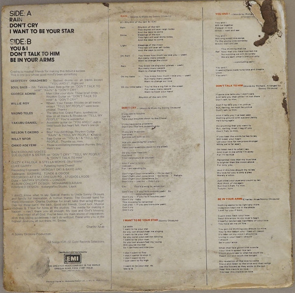 ![]() ![]() | Poor Charley Akaa - Don't CryPop/Nigerian Boogie | Nigeria |19831983 LP from Nigerian musician Poor Charley Akaa released on Gold Records. Charley Akaa, sometimes spelled Charlie Akaa, released at least two LPs in the 1980s that blended elements of Nigerian boogie, disco, and country music - this one being the first of the two. This LP features several other prominent Nigerian musicians like Dizzy K. Falola, Stella Monye, and George Achini, among others. The record was produced by Sonny Okosun. Charley also has credits on over two dozen LPs by other artists, contributing vocals, bass gutiar, and saxophone. I do not know if Charlie Akaa is still alive or if he continued to release music after his 1989 sophomore LP. If anyone know please reach out! Charley's song "Be In Your Arms" appeared on the amazing 2017 compilation of Nigerian country music, Like Nashville In Naija. |