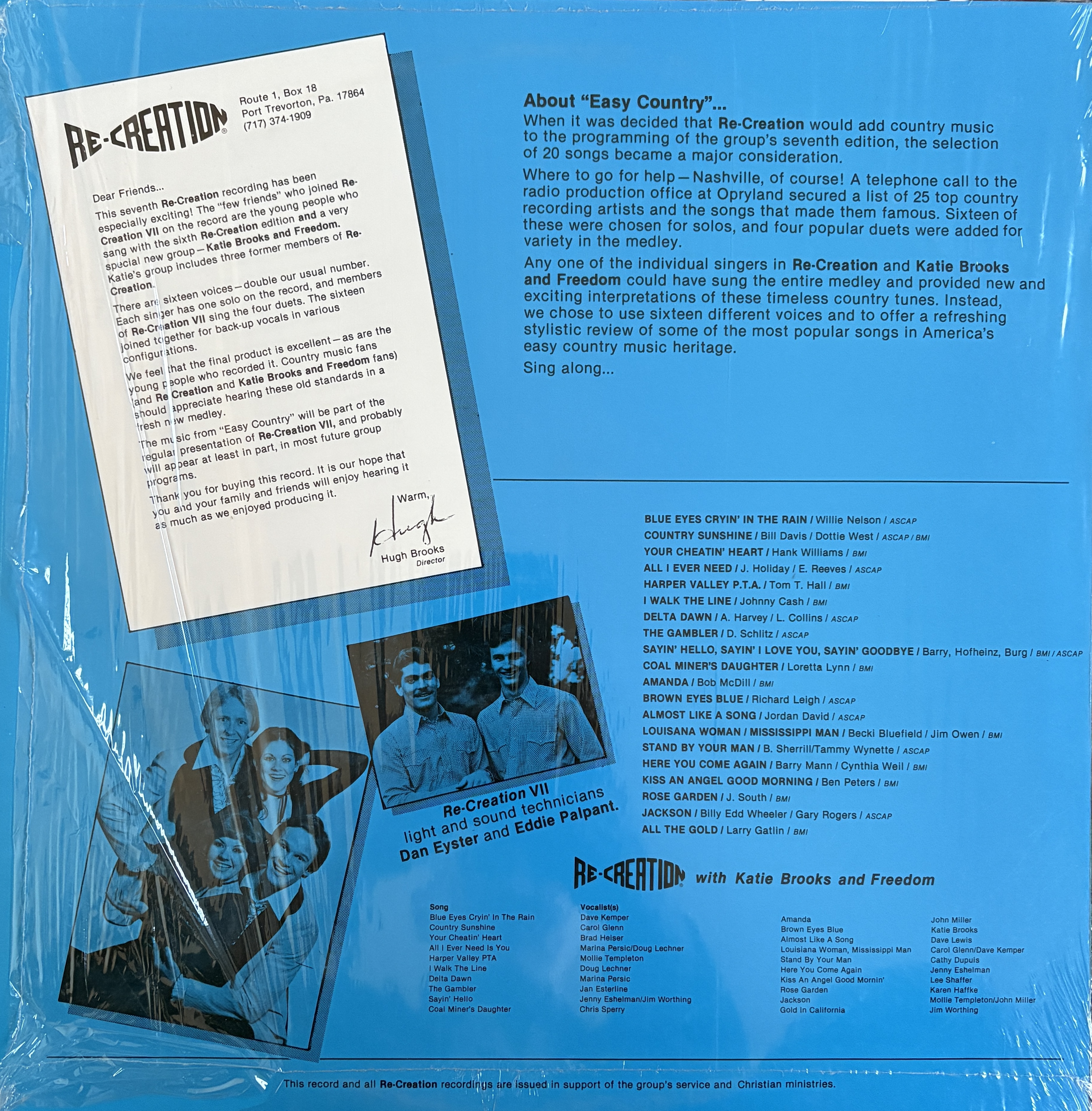 ![]() ![]() | Re-Creation - Easy CountryCountry | Pennsylvania | 1981LP from Penn State University singing group Re-Creation. The group was formed in 1976 by Hugh and Carolyn Brooks. Most of their work is religious, but this LP consists of big country music hits of the 60s and 70s. Re-Creation has a long and well-documented history that you can read more about at their website re-creationusa.org. It looks like the group/organization ended their run in 2023. |