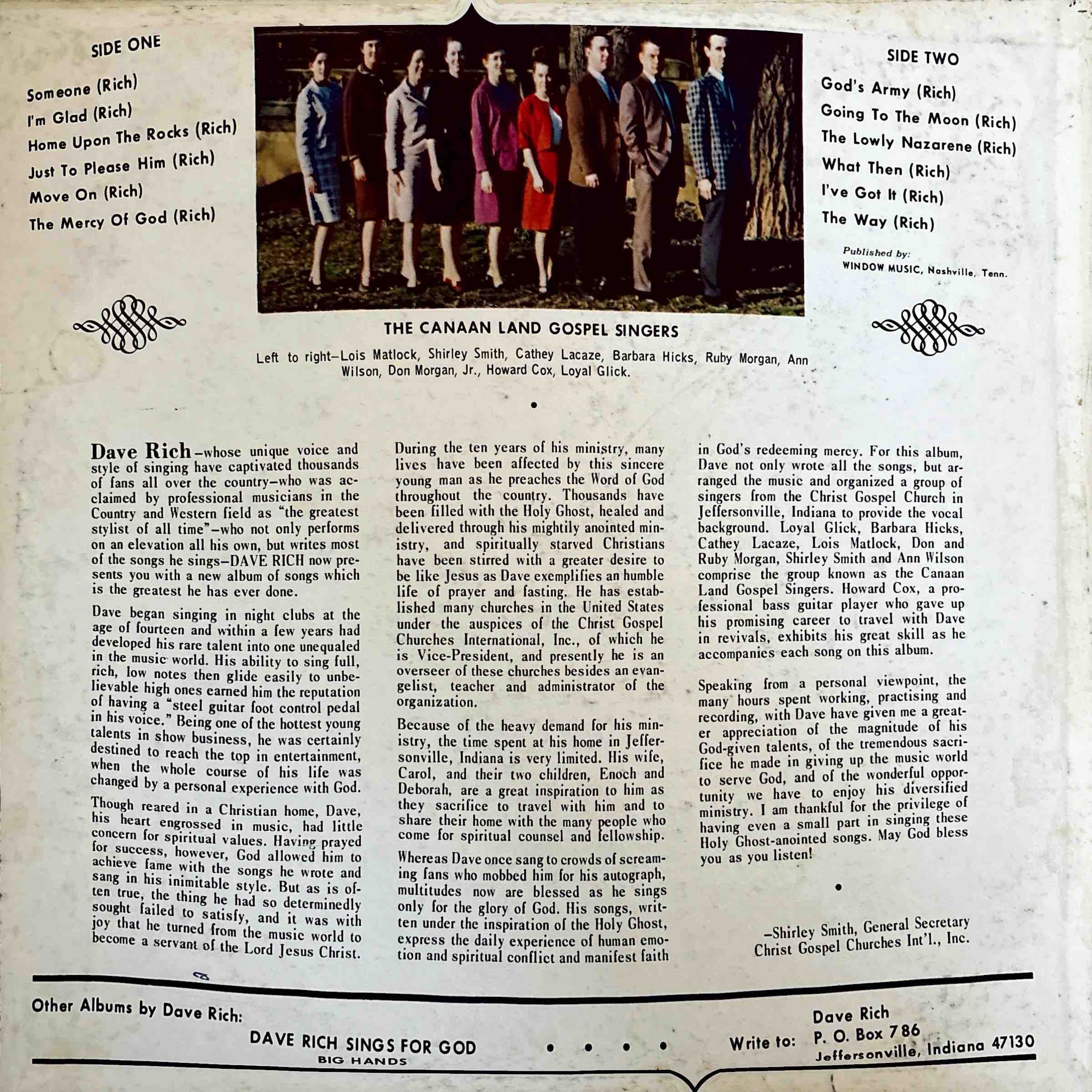 ![]() ![]() | Rich, Dave - Songs Given By GodCountry-Gospel | Indiana | Unknown YearCountry-gospel LP from Indiana musician Dave Rich, released on Christ Gospel Records. Dave Rich (1936-2020) was from Muhlenberg Country, Kentucky. He recorded a steady stream of country and rockabilly tracks in the 1950s and 1960s, mostly for RCA Victor. Sometime in the 1960s he turned to gospel music, founding Christ Gospel Churches International and releasing a handful of religious LPs. Bear Family has a CD compilation of some of his pre-gospel music that is worth checking out! Also appearing on this album are The Canaan Land Gospel Singers. This singing group consisted of Lois Matlock, Shirley Smith, Cathey Lacaze, Barbara Hicks, Ruby Morgan, Ann Wilson, Don Morgan Jr., Howard Cox, and Loyal Glick. All songs on the LP were written and composed by Rich. |
