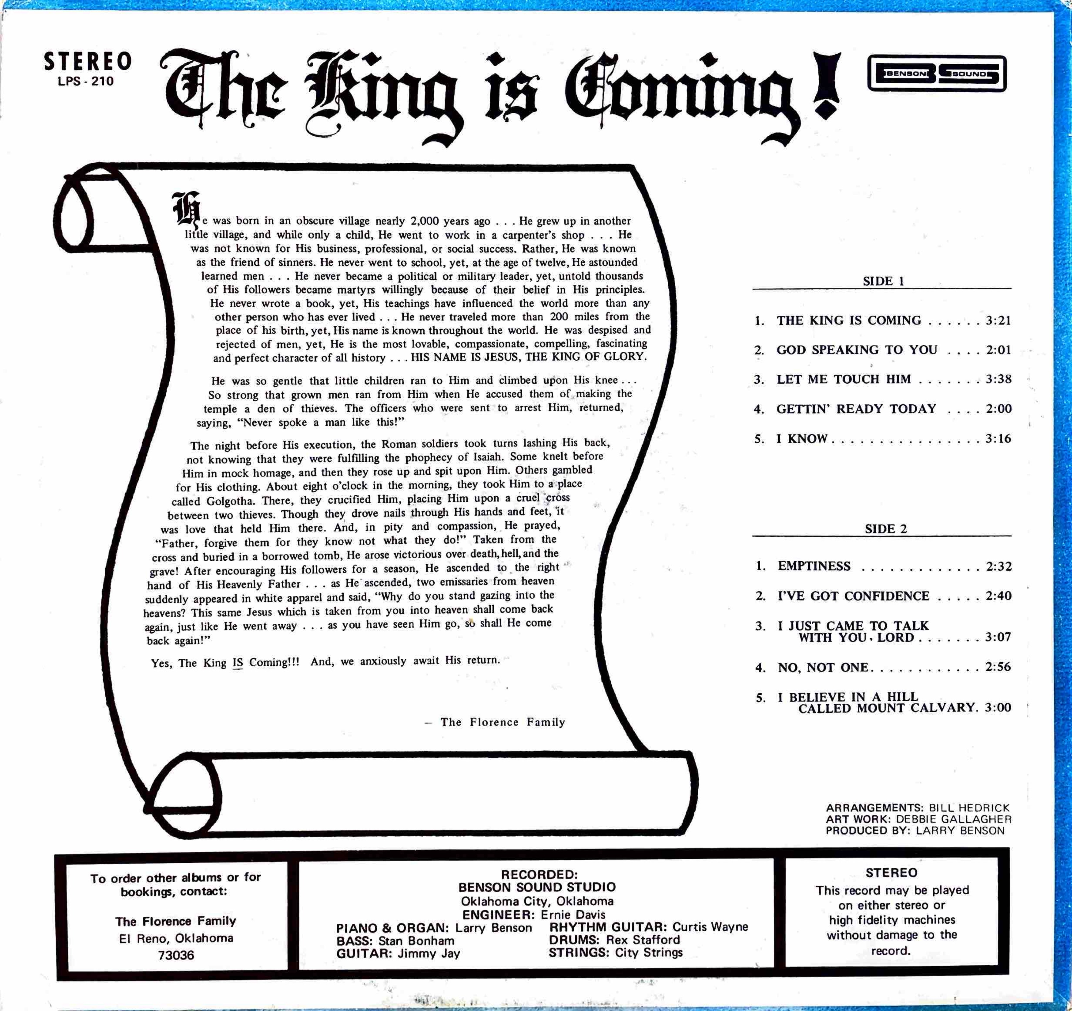 Florence Family, The - The King Is Coming!Gospel | Oklahoma | 1970Description coming soon! Tracklist A1 The King Is Coming A2 God Speaking To You A3 Let Me Touch Him A4 Gettin' Ready Today A5 I Know B1 Emptiness B2 I've Got Confidence B3 I Just Came TO Talk With You, Lord B4 No, Not One B5 I Believe In A Hill Called Mount Calvary No URL available. |